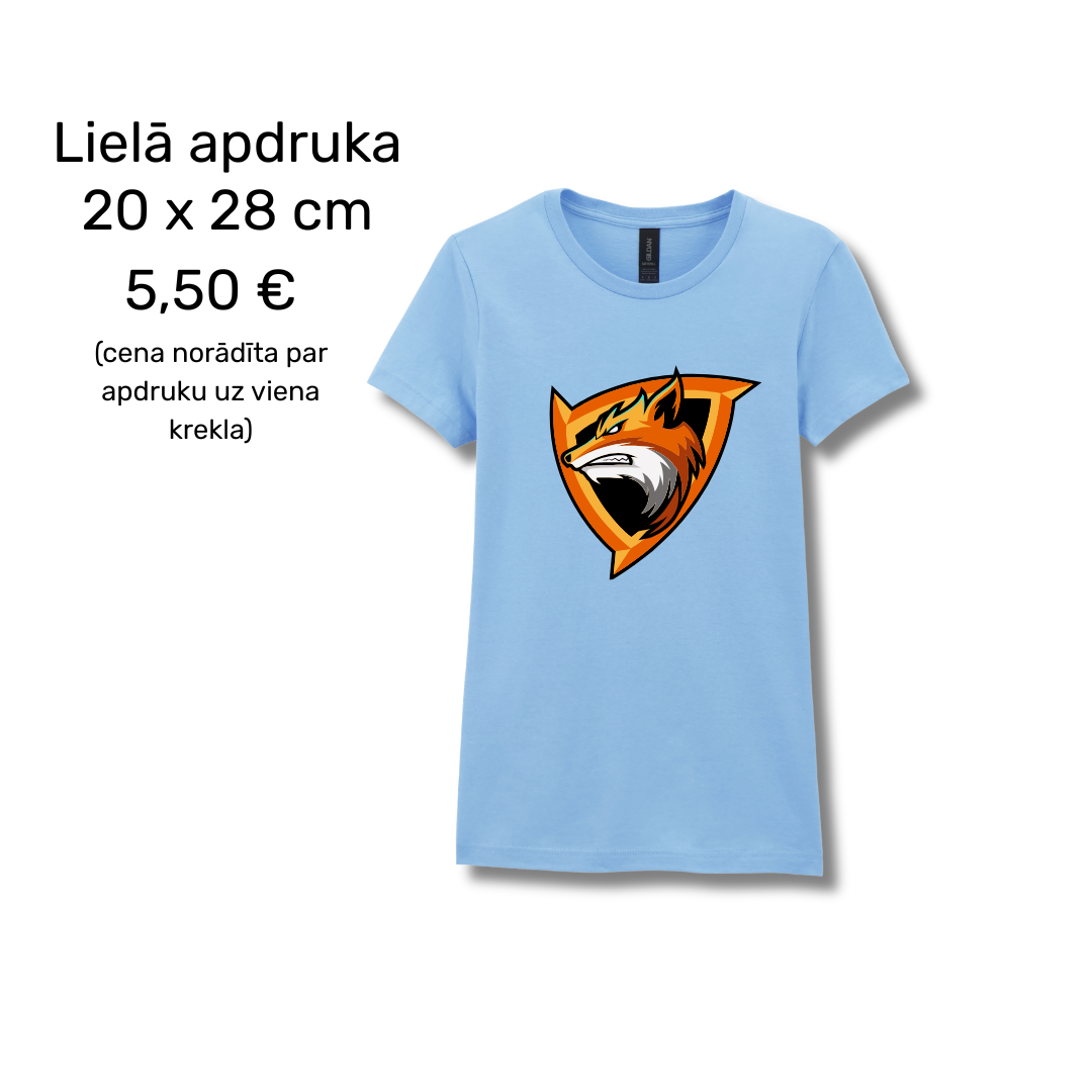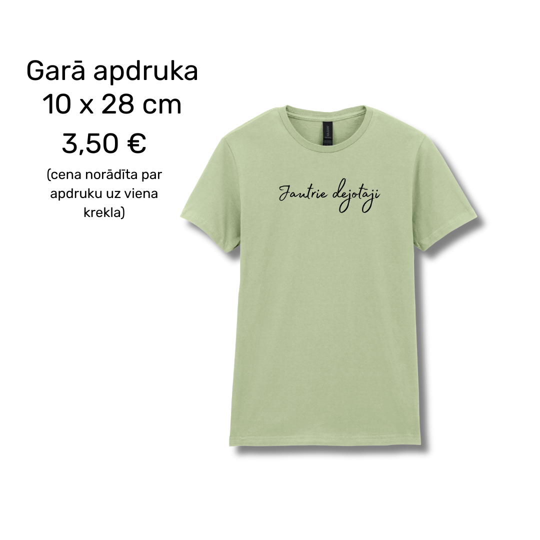 Vēlies apdruku abās pusēs? Vienkārši pievieno grozam vēl vienu apdrukas komplektu! Izmērus var kombinēt (piemēram, Mazā apdruka priekšpusē un Lielā uz muguras).