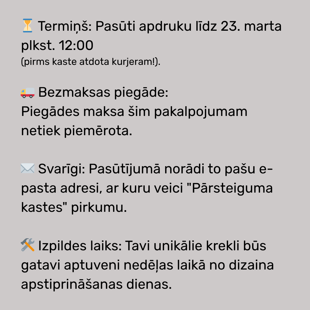 🚨 Svarīgi par noformēšanu: Tehnisku iemeslu dēļ, noformējot pirkumu, sistēma lūgs izvēlēties pakomātu. Droši izvēlies jebkuru sev ērtāko – piegādes maksa šim pakalpojumam būs 0.00 €, un apdrukātos kreklus mēs automātiski pievienosim Tavam jau esošajam "Pārsteiguma kastes" sūtījumam!